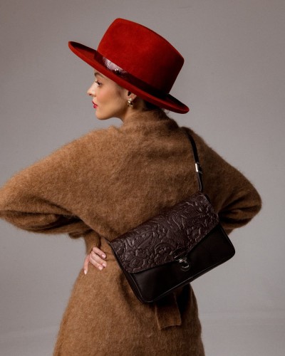 - Materiał: skóra naturalna w kolorze brązowym, skóra ozdobna z kwiatowym tłoczeniem